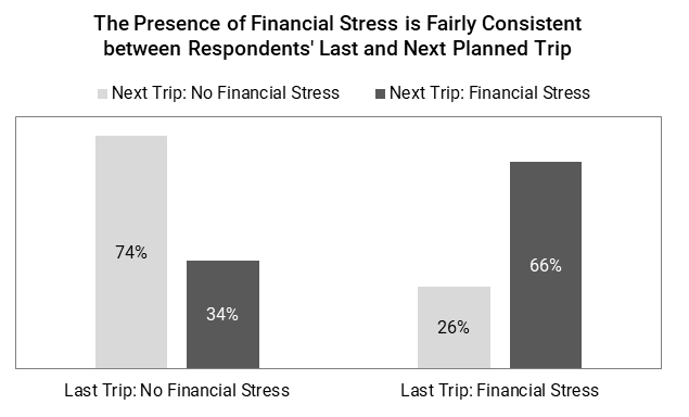 Most respondents feel strained by finances, even if it wasn't their top stressor. In total, 39 respondents (66% of the sample) said finances contributed to their travel planning stress. Those who reported financial stress on their last trip were more likely to report it again on their next trip—66% of them did so.