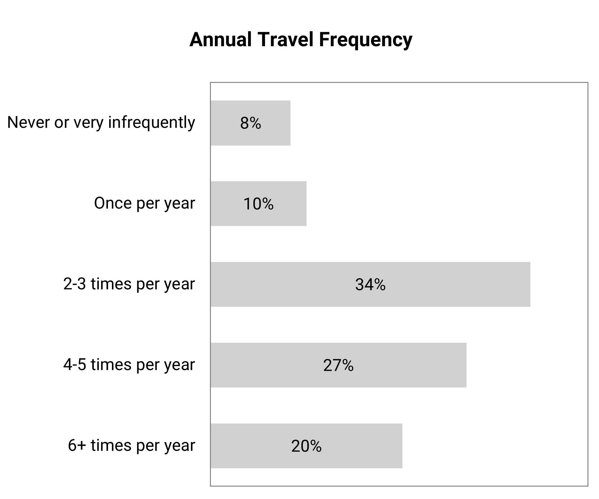 92% of the sample travels at least once per year on a regular basis, with 81% traveling 2-3 times per year or more. One-fifth (20%) of the sample travels for leisure 6+ times per year.